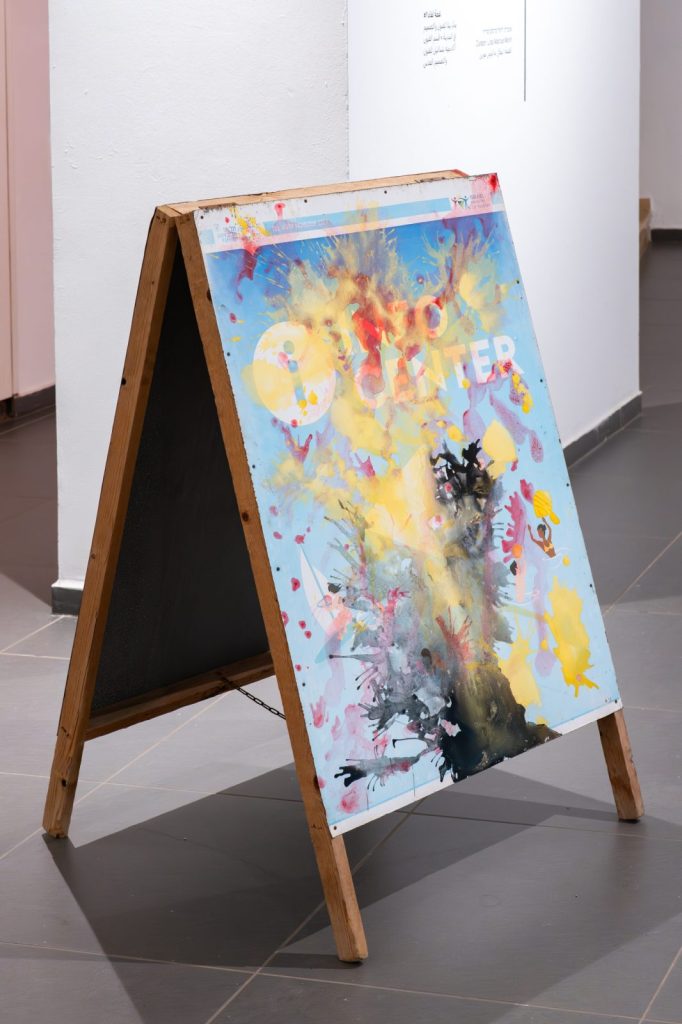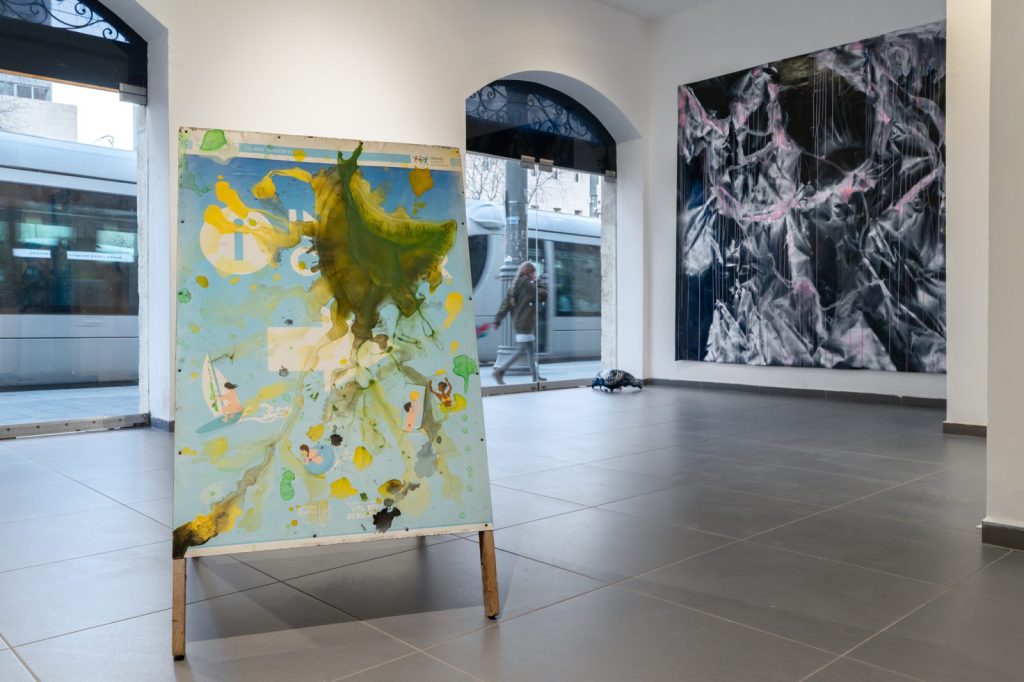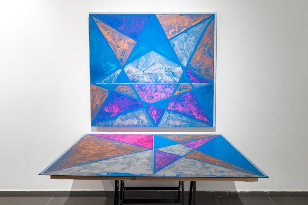 تكوّنت الأعمال في المعرض من مخزون مواد مصدره الفضاء اليوميّ والوظيفيّ: أقمشة تظليل بلاستيكية، بلاكسغلاس، مصابيح درّاجات نارية، مظلّات، طاولة تنس الطاولة، وأشياء صناعية أخرى. لا تُستخدم المادة هنا كحاملٍ محايد للفعل الفنّي، بل كموقعٍ مشحون، يحمل معه طبقاتٍ من الاستعمال والوظيفة والزمنية. فأسلوب اللعب لا ينفصل عن المادة، بل ينبثق منها، استجابةً للحمولة الوظيفية التي تحملها.