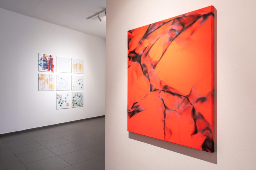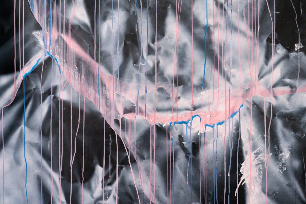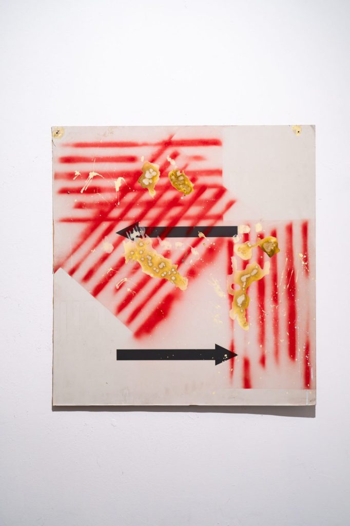 الفعل التشكيلي – رذاذ، صباغ، طلاء ورنيش، أو إيماءة مادية أخرى – يعمل داخل الحامل، في تفاوضٍ مع فضاءٍ مشحونٍ سلفًا بالدلالات. وبهذا المعنى لا تنخرط المادة في اللعبة، بل تتحوّل، على نحوٍ مفارق، إلى بنية اللعبة ذاتها.